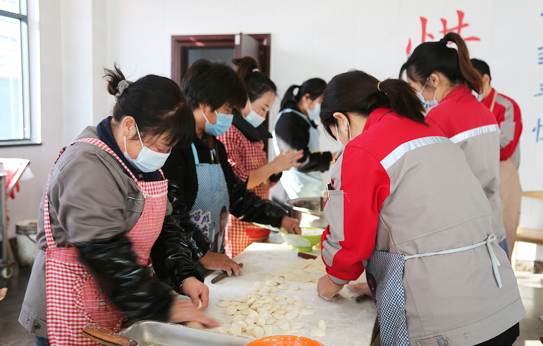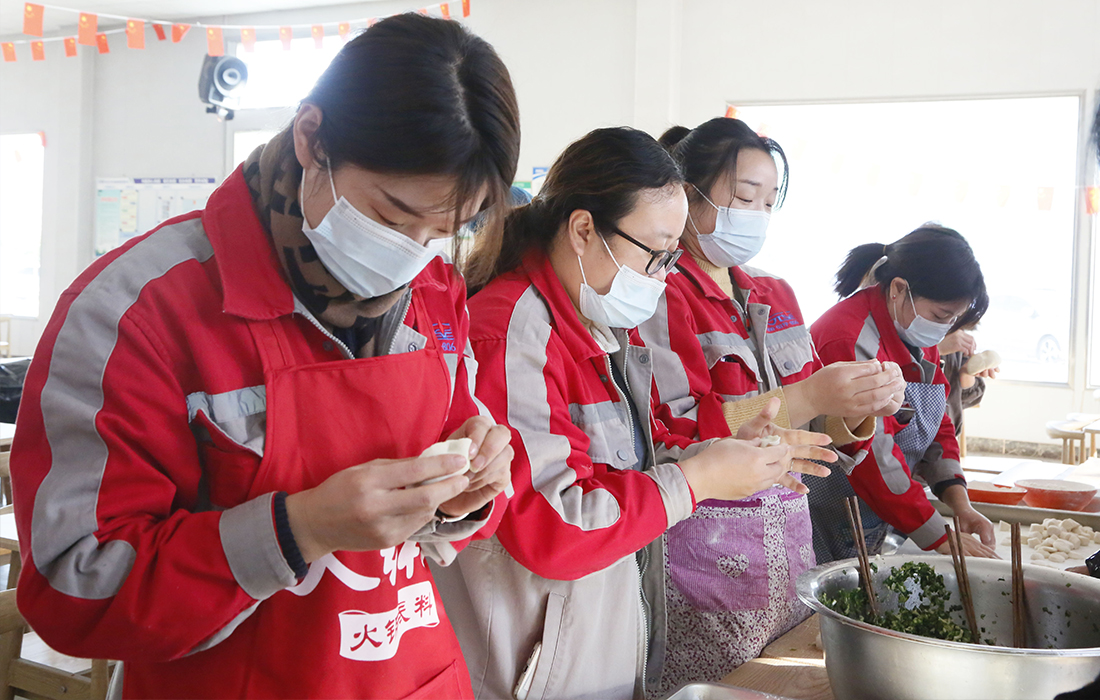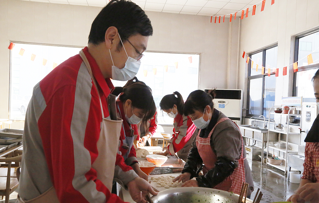活動現(xiàn)場,員工們積極參與,熱情高漲,整個過程中歡聲笑語不斷,從揉面團(tuán)、搟餃子皮、制作餡料到包餃子等工序都是由全體員工分工合作完成。在包餃子過程中還特意挑選14個包了花生的“幸運餃子”作為員工抽獎使用,吃到“幸運餃子”的員工第二天中午可以免費就餐。